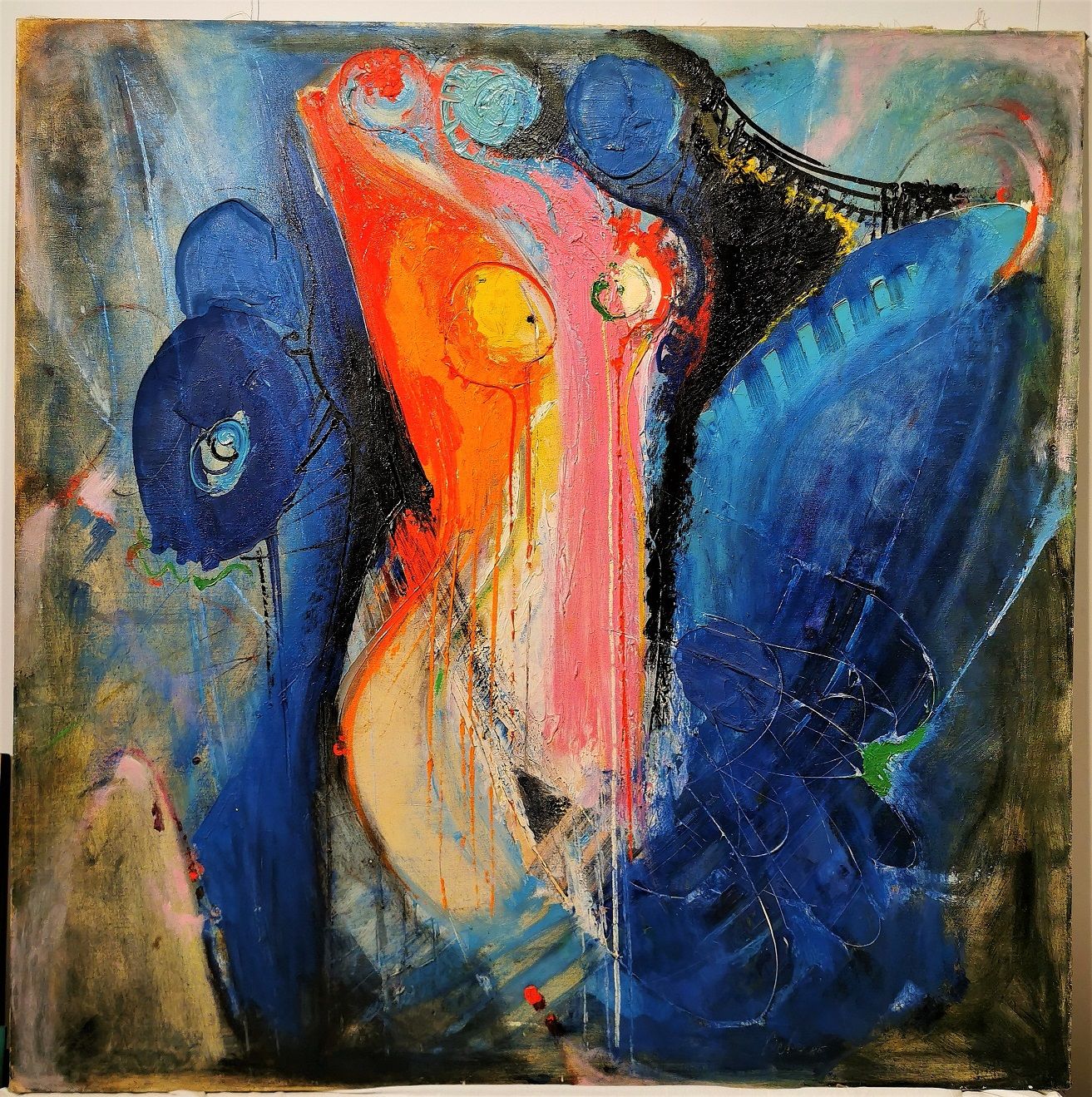 La musique, olej na plátně, 120 x 120 cm, signováno a datováno vpravo dole Pecka 85.